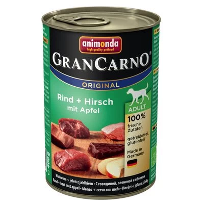 Afstammend van de wolf heeft het gedrag en uiterlijk van de hond zicht in 15.000 jaar dat hij samen leeft met de mens sterk veranderd. Zijn voedingsfysiologische behoeften naar dierlijke proteïnen blijft daarentegen hetzelfde. In Animonda GranCarno Original worden uitsluitend zorgvuldig gekozen, hoogwaardige vleessoorten, bestaand uit hart, long, lever en spiervlees verwerkt. De zorgvuldige en verse bereiding van ingrediënten zorgt daarbij voor behoud en optimale beschikbaarheid van voedingsstoffen. Zo blijft ook de natuurlijke structuur van het vlees behouden, een teken van versheid en natuurlijkheid. Ook de natuurlijke vleessmaak blijft daardoor behouden, wat voor de hoogste acceptatie zorgt. Van koolhydratenbronnen als granen of aardappelen wordt in de recepten geheel afgezien, ook worden granen en soja vermeden, en worden er geen smaakversterkers of kunstmatige kleurstoffen en conserveringsmiddelen toegevoegd. Met een speciale combinatie van verschillende antioxidanten wordt het immuunsysteem ondersteund en de weerstand verhoogd.