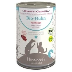Herrmann’s Vlees Hondenvoer is een bijzonder hoogwaardig hondenvoer – ook uitstekend geschikt voor katten – van gecertificeerde biokwaliteit. Het vlees dat gecontroleerd biologisch gefokt wordt, komt direct van de boerderij. Het vlees wordt op een diervriendelijke manier gefokt en geslacht. Herrmann’s puur vlees in blik is ideaal voor de hondenbezitter, die geen koolhydraten en voedingsvezels in voedsel wenst of graag zelf verse groenten aan het voer wil toevoegen.