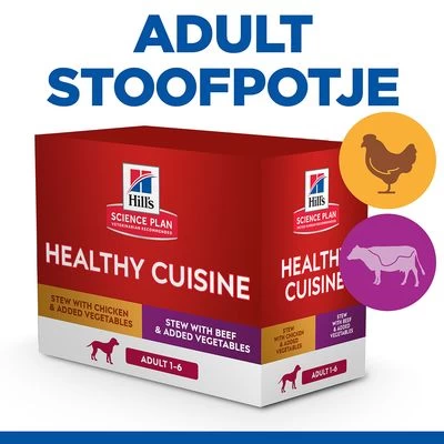 Heerlijk sappig en simpelweg lekker: met Hil’s Science Plan Canine Adult Healthy Cuisine met Kip & Rund wordt iedere maaltijd een feestmaal. Het is een appetijtelijk stoofpotje voor volwassen honden, dat met smaakvolle ingrediënten bereid is en perfect afgestemd is op de behoeftes van je lieveling.