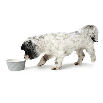 Grijze voerbak van voedselveilig keramiek. Chique ruitreliëf. Geschikt voor de vaatwasser. Stevige stand door antislipring aan onderzijde. Met reliëf.