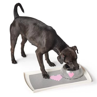 Het patroon met zwarte strepen en roze hart maakt van deze set van voerbak en placemat een mooie blikvanger die goed in een modern design past. Zowel de voerbak van melamine als de placemat zijn gemaakt van voedselveilig materiaal dat hygiënisch en tegelijkertijd onderhoudsvriendelijk is.Â