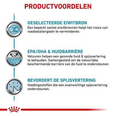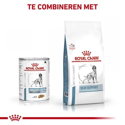 Symptomen zoals chronische en acute diarree evenals ontstekingen in de darm of maag zijn vaak tekenen voor allergieën. Ook jeuk, huidontstekingen evenals vachtproblemen kunnen allergische reacties zijn. Royal Canin Sensitivity is een dieet natvoer voor honden, met voedingsmiddelallergieën of voedingsmiddelintoleranties, die tot ziekten van het maag-darmkanaal hebben geleid. De gezondheid van de darmslijmhuid wordt met dit voer ondersteund en een evenwichtige darmflora wordt bevorderd. Rijst en kip als zeer goed verdraagbare voedingsstofcombinatie helpen, het risico van een allergische reactie te verminderen. Biotine, niacine en pantotheenzuur in combinatie met een zink-linolzuurmix kan het verlies van vocht via de huid reduceren en daarmee de barrièrefunctie versterken. De toevoeging van de essentiële omega-3-vetzuren EPA en DHA kunnen bovendien ontstekende reacties van huid verminderen. Voor een evenwichtige darmflora zorgt de toevoeging van prebiotisch FOS.