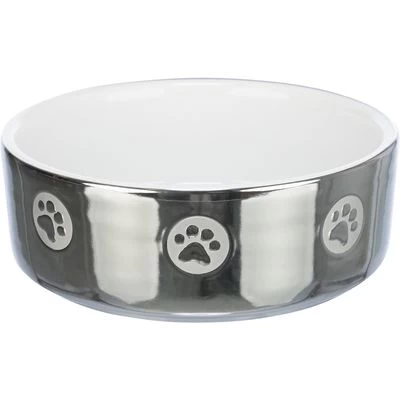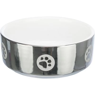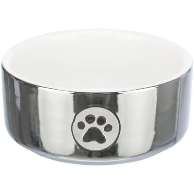 Glanzende voerbak voor honden & katten. Zilverkleurige buitenkant met pootje. Met hoge rand. Blijft op plek staan door hoge gewicht. Gemaakt van keramiek.